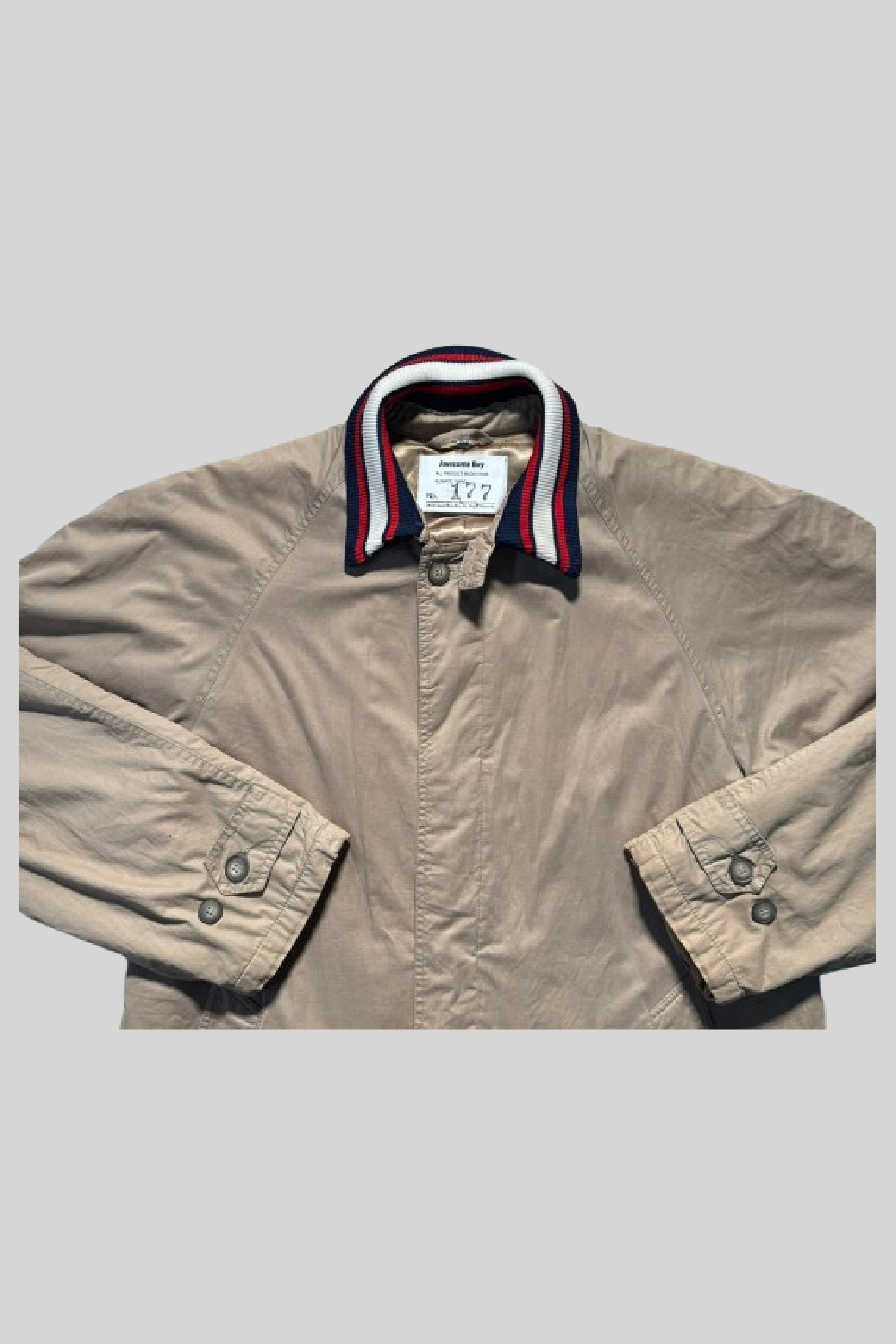 Stadium jacket rib tape is attached to the collar.
