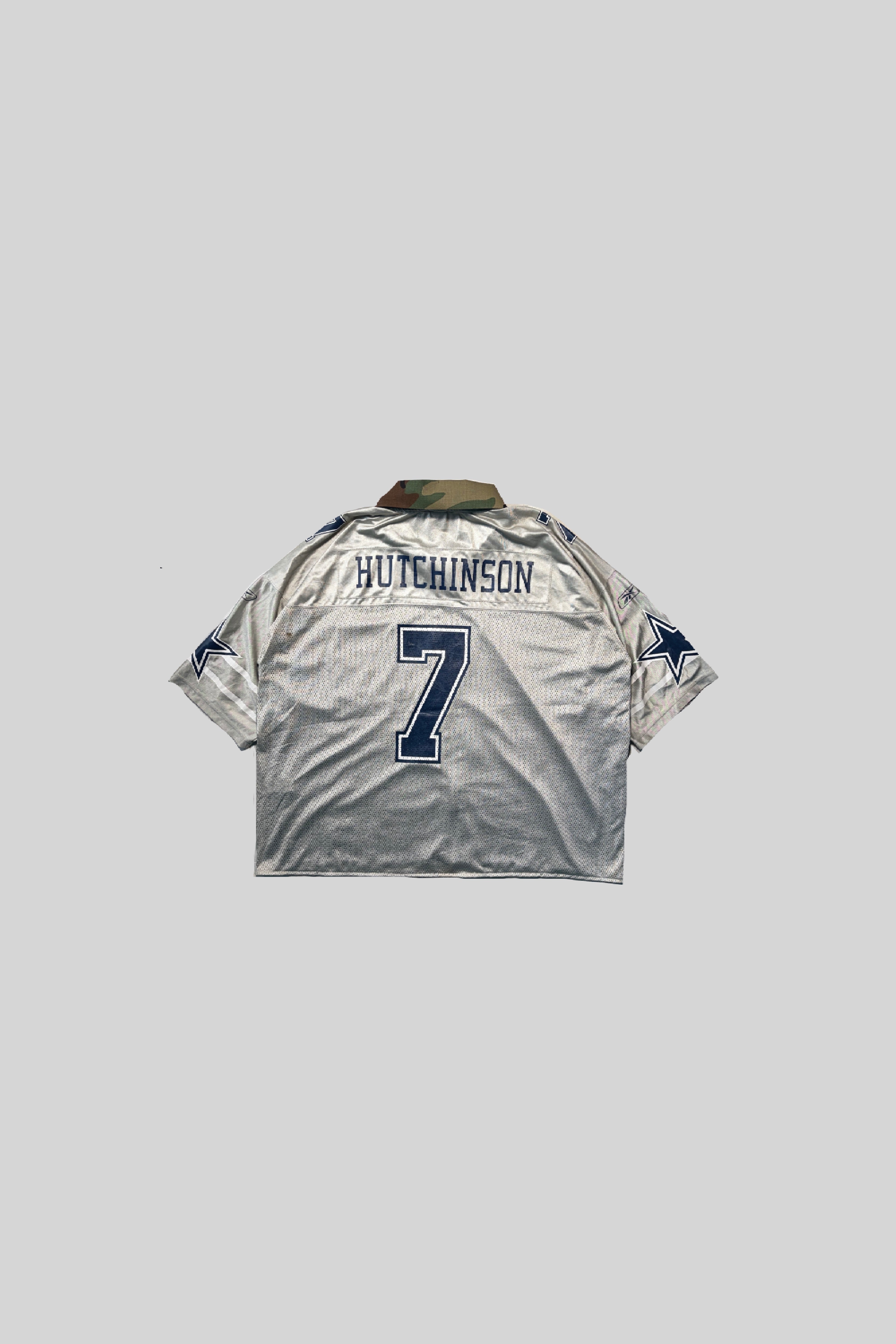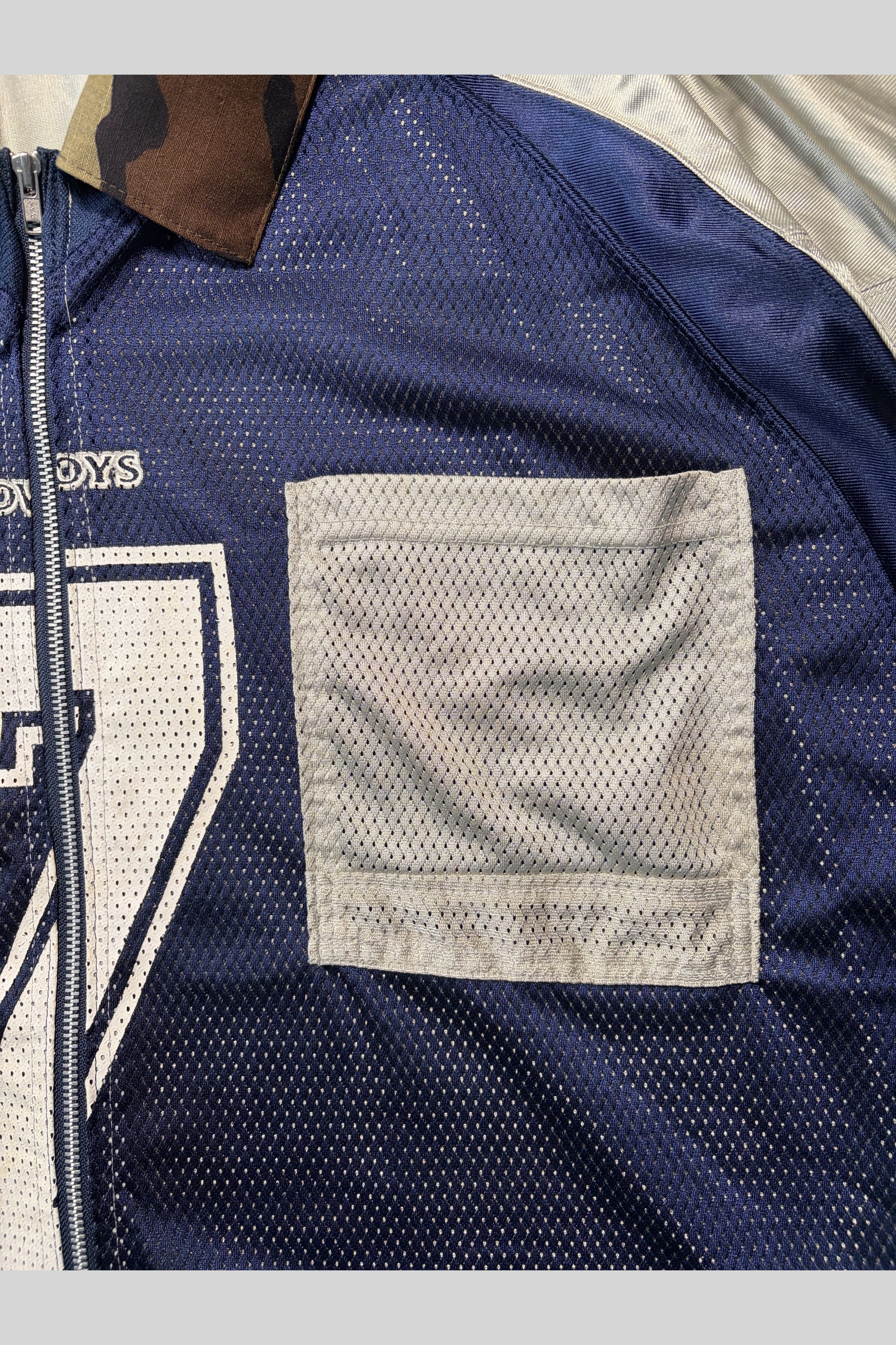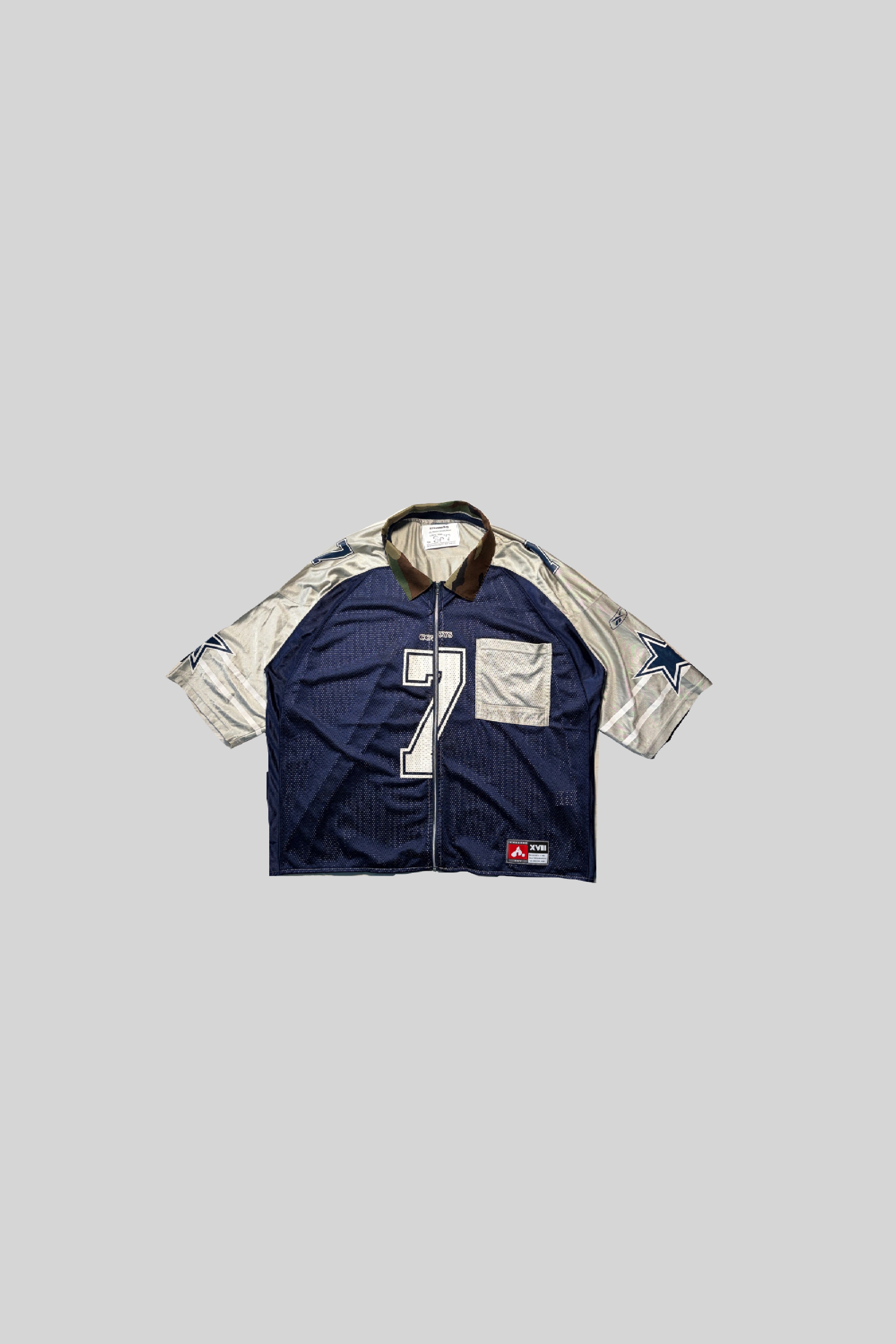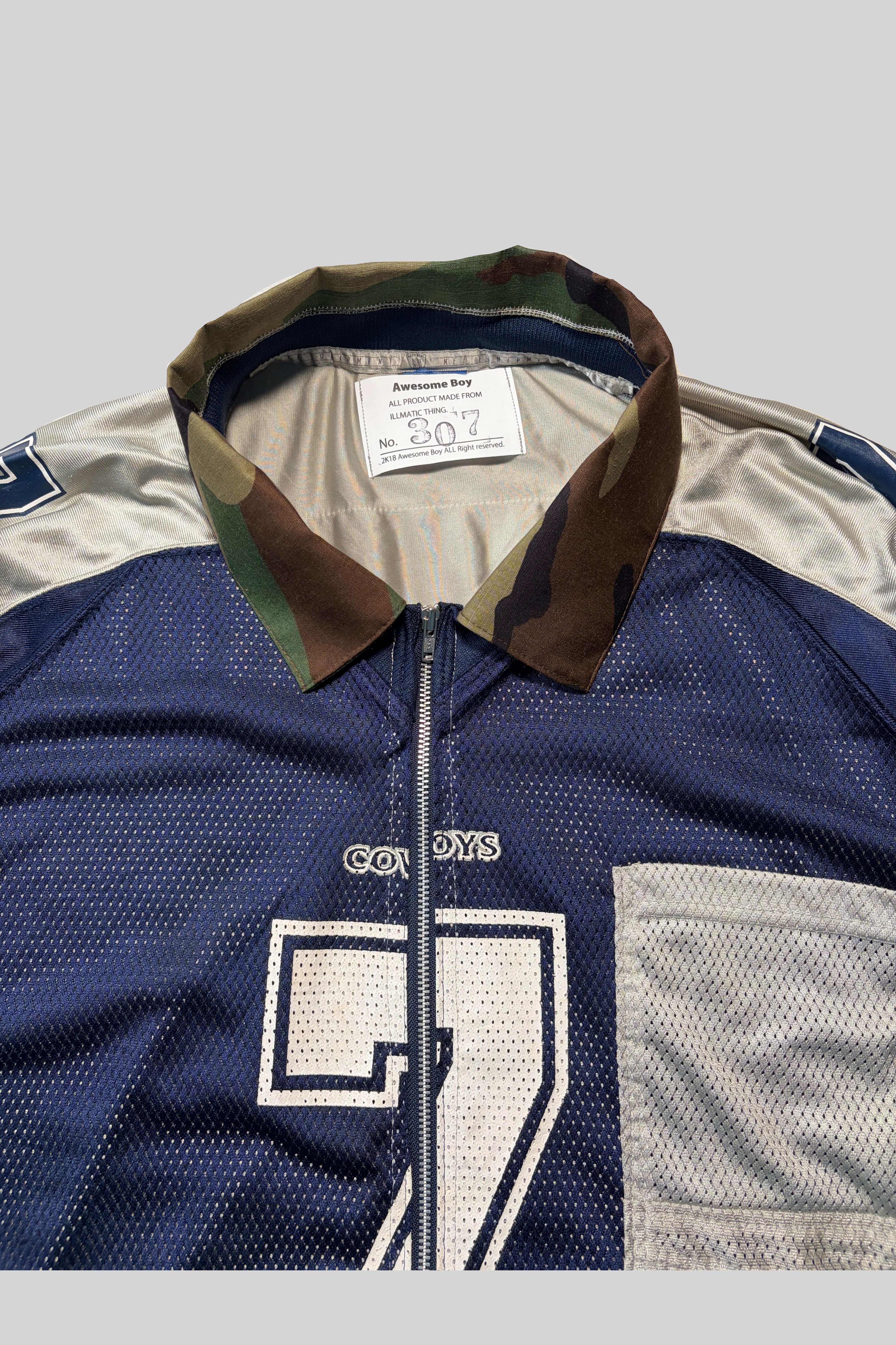 Deconstructing an American football jersey and reconstructing it into a zip-up shirt.